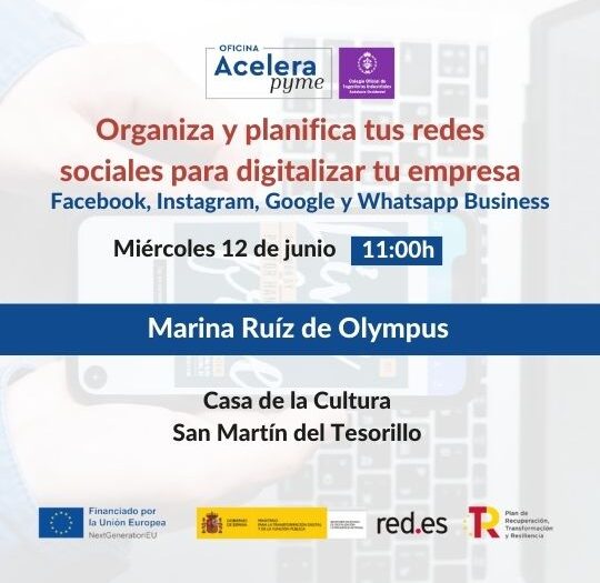 En Acelera Pyme estamos encantados de anunciar nuestro próximo evento titulado “Organiza y planifica tus redes sociales para digitalizar tu empresa: Facebook, Instagram, Google y WhatsApp Business”. Este taller se llevará a cabo el próximo miércoles 12 de junio a las 11:00 de la mañana en la Casa de la Cultura de San Martín del Tesorillo.