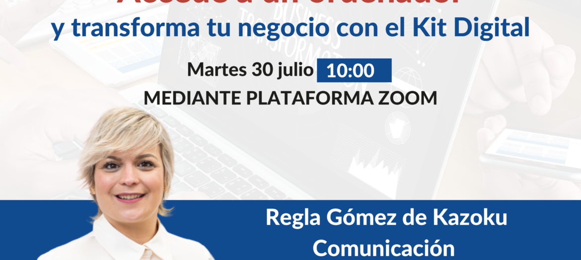 Te presentamos nuestro próximo evento titulado “Accede a un ordenador y transforma tu negocio con el kit digital”, que se llevará a cabo el martes 30 de julio a las 10:00 de la mañana a través de Zoom. Esta sesión será dirigida por Regla Gómez de Kazoku Comunicación, experta en Marketing Digital, quien te guiará a través de las posibilidades que ofrece el KIT Digital para potenciar tu negocio.
